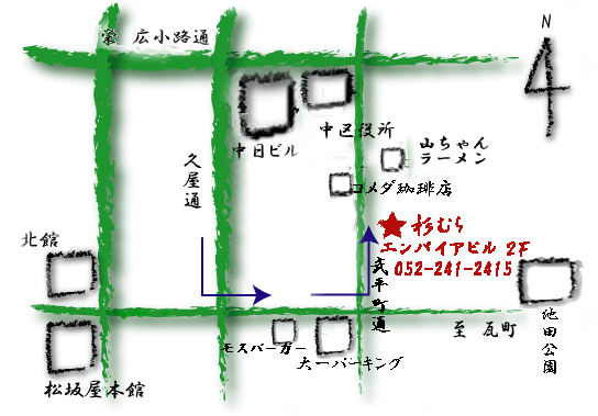 ![]() 店舗の前の道は一方通行になっております。 タクシー等お車でお越しの際は、青い矢印 → に沿ってお越し願います。 地下鉄でお越しの際は、栄K出口 又は 矢場町@出口 となります。 詳しい地図はこちら |